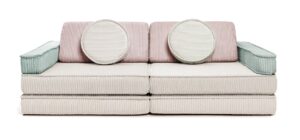 De happy Sofa bestaat uit acht onderdelen – vier zitkussens (elk twee aan elkaar genaaid), twee driehoeken als rugleuningen, twee armleuningen en twee ronde kussens – waardoor uw kind een comfortabele en ondersteunende structuur krijgt om op te spelen. De happy sofa is 160 cm breed en 80 cm diep. Hij is 56 cm hoog met een zithoogte van 25 cm. Als slaapoplossing kan de sofa geconfigureerd worden tot 160cm breed x 172.5cm lang… meer slaapruimte dan een tweepersoonsbed!
